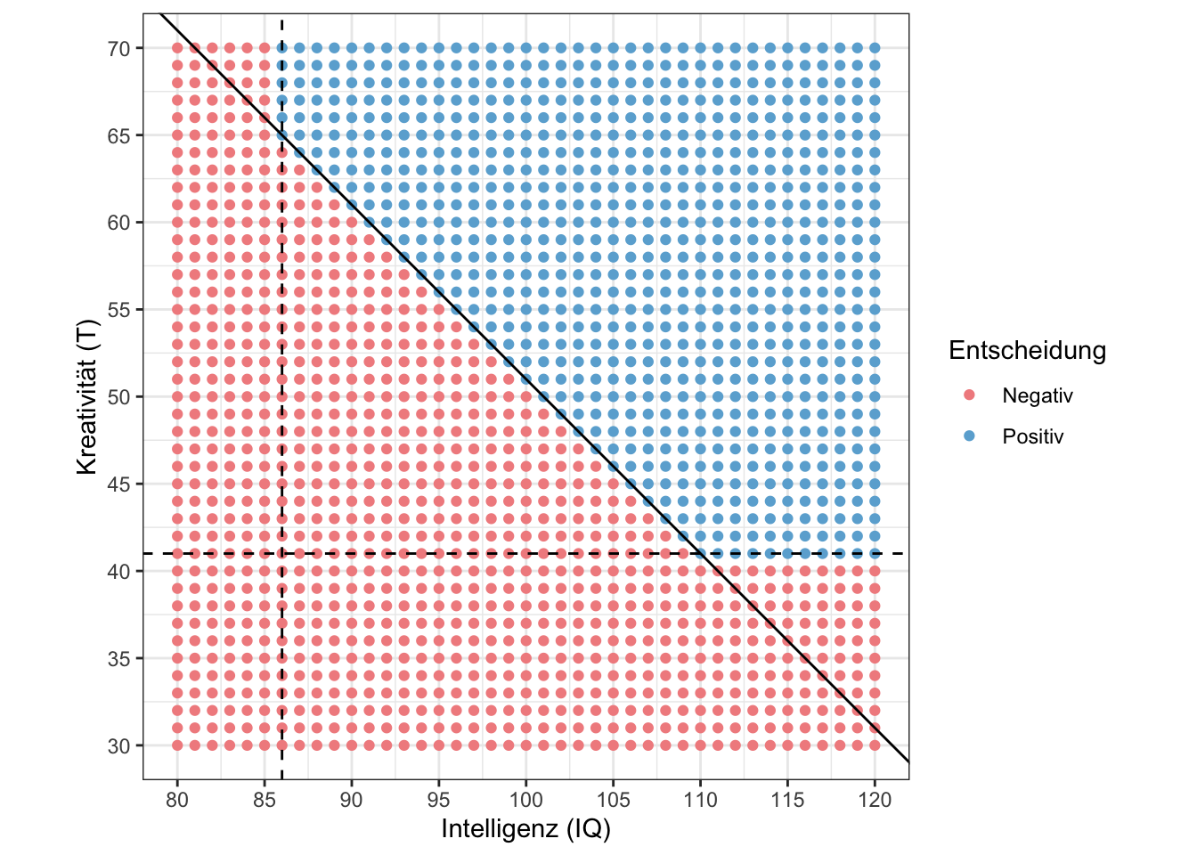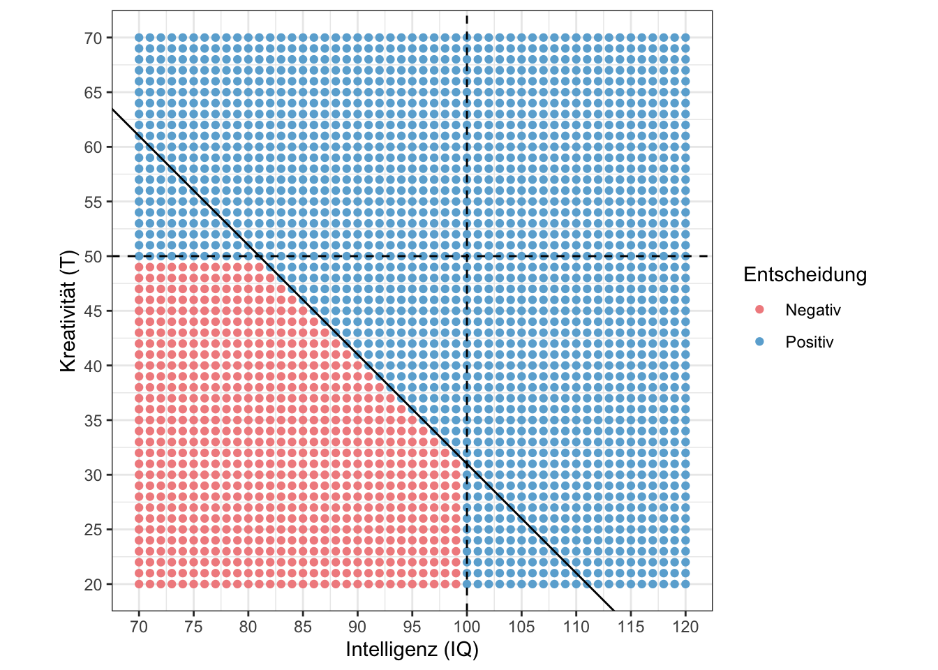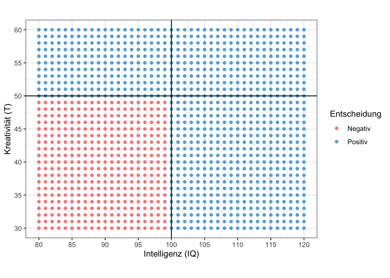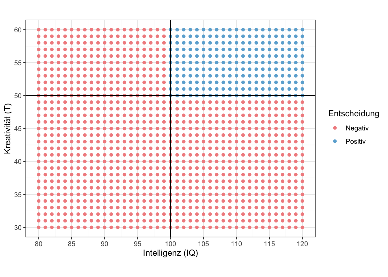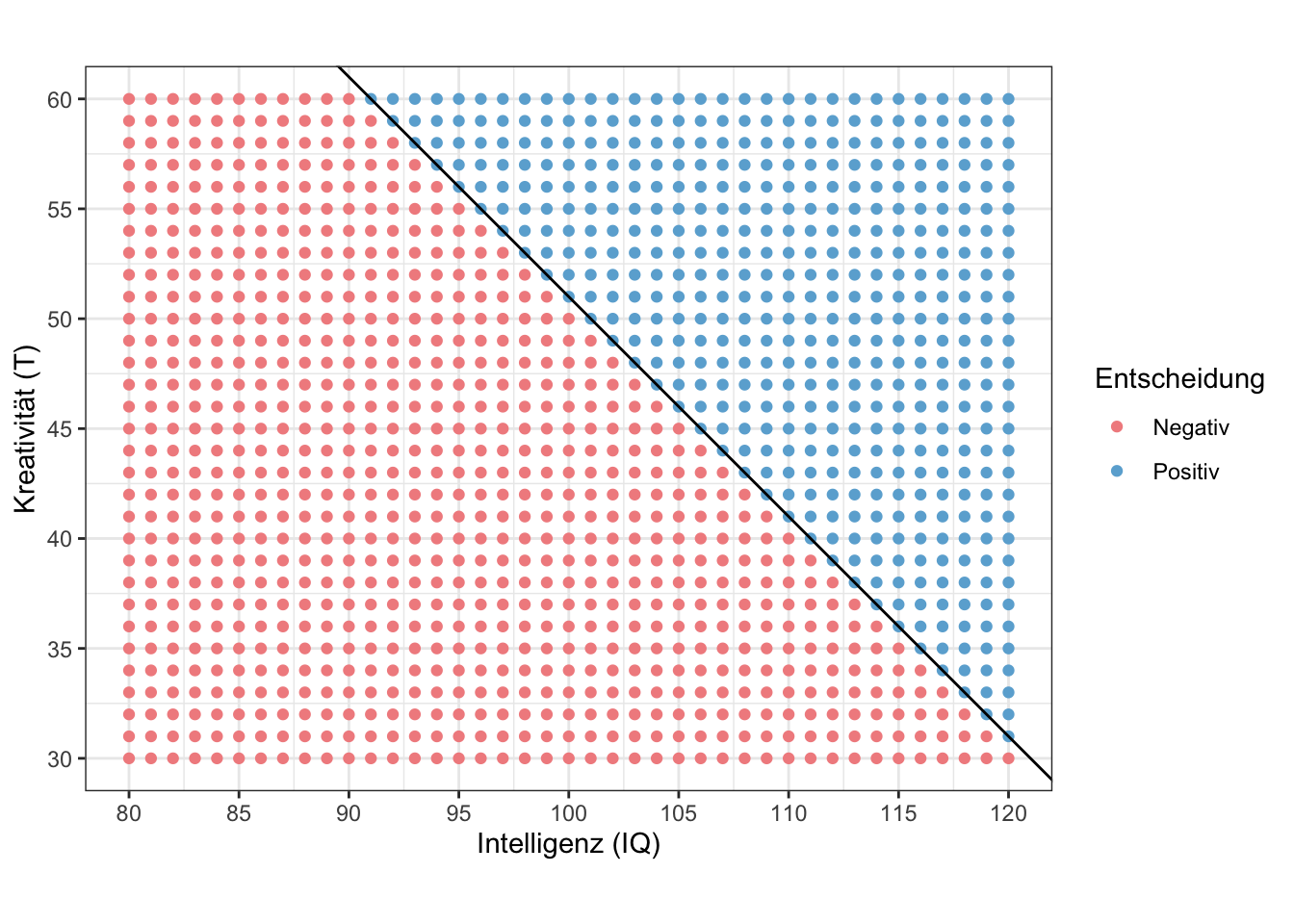 Bei Entscheidungen anhand von zwei Kriterien, lassen sich die Wertebereiche, in denen entweder eine positive oder eine negative Entscheidung getroffen wird, leicht in einem Plot darstellen: