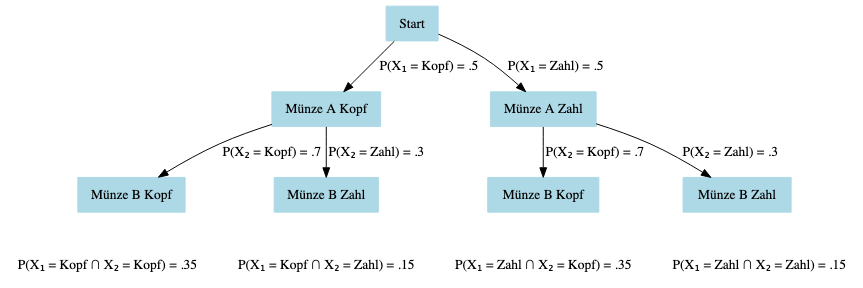 Die Wahrscheinlichkeit, dass ein Wurf von Münze A Kopf ergibt, ist \(0.5\). Die Wahrscheinlichkeit, dass ein Wurf von Münze B Kopf ergibt, ist \(0.7\). Zeichnen Sie einen Entscheidungsbaum für alle möglichen Ereignissenkombination der Münzwürfe A und B. Berechnen Sie anschließend die Wahrscheinlichkeiten aller möglichen Kombinationen von Münzwürfen A und B unter der Annahme, dass die Münzwürfe unabhängige Ereignisse sind. Sie können den Münzwurf A als Zufallsvariable \(X_1\) und den Münzwurf B als Zufallsvariable \(X_2\) auffassen.