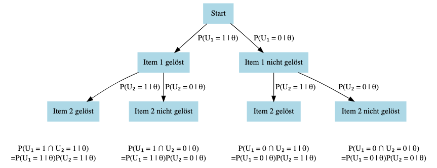 \(= P(U_1 = 1 | \theta) \cdot P(U_2 = 0 | \theta)\) (Unter Annahme lokaler stochastischer Unabhängigkeit)