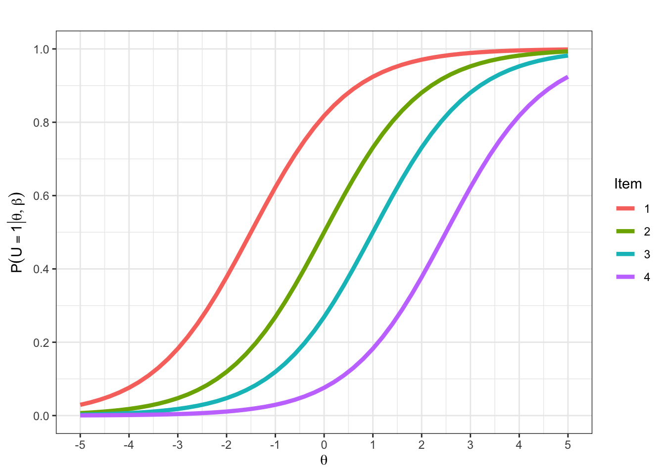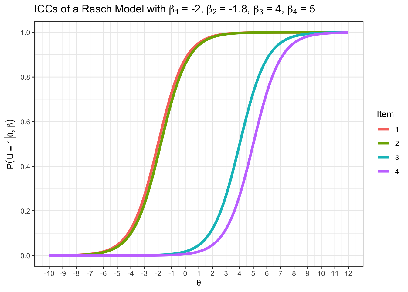 \(P(U_{ij} = 1 | \theta_i = 2, \beta_1 = -2) = \frac{ 1 }{ 1 + exp(\beta_j-\theta_i) }= \frac{ 1 }{ 1 + exp(-2-2) }\approx.98\)