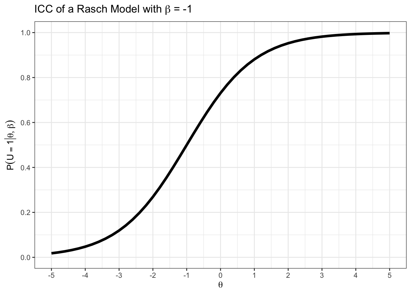 Die Wahrscheinlichkeit (\(P\)), dass die Antwort von Person \(i\) auf Item \(j\) (Zufallsvariable; \(U_{ij}\)), dem beobachteten Wert von Person \(i\) auf item \(j\) (\(u_{ij}\)) entspricht (\(=\)), gegeben (\(|\)) des Personenparameters von Person \(i\) (\(\theta_i\)), und des Itemparameters von Item \(j\) (\(\beta_j\)).