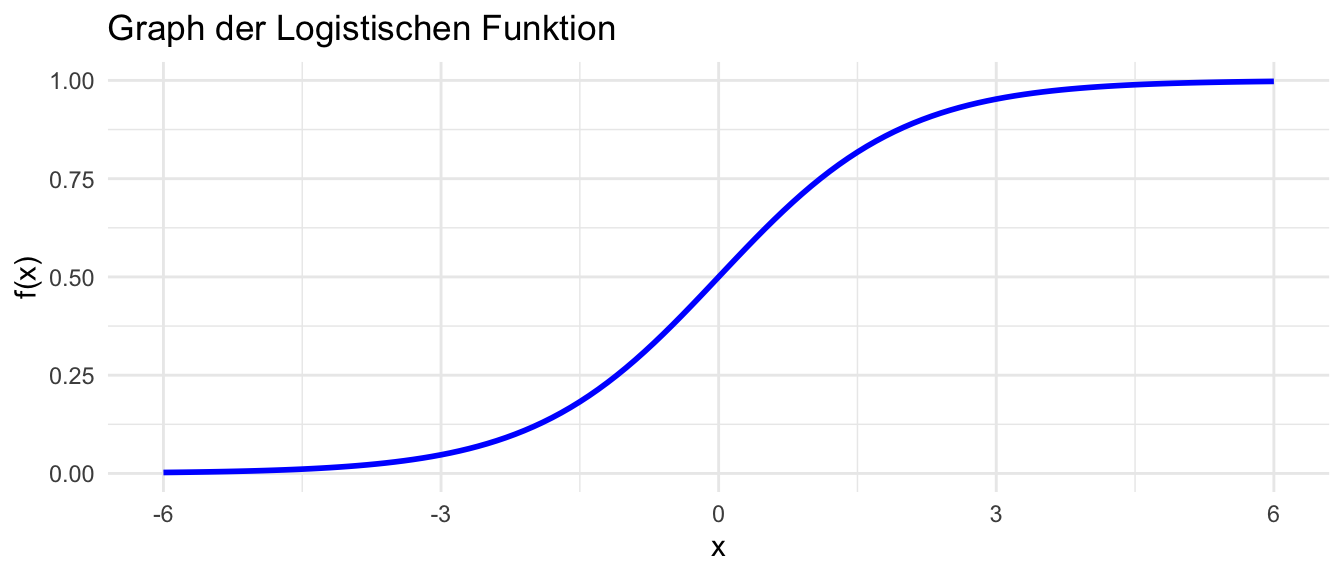 Die Funktion mit der Vorschrift \(f(x) = \frac{e^x}{1 + e^x}\) für alle reellwertigen \(x\) nennt man logistische Funktion. Die logistische Funktion transformiert reelle Zahlen (x-Achse im Plot) in Werte zwischen 0 und 1 (z.B. Wahrscheinlichkeiten; y-Achse im Plot). Formal drückt man das so aus: \(f: \mathbb{R} \rightarrow (0, 1)\). Die logistische Funktion wird Ihnen in der IRT noch oft begegnen.
